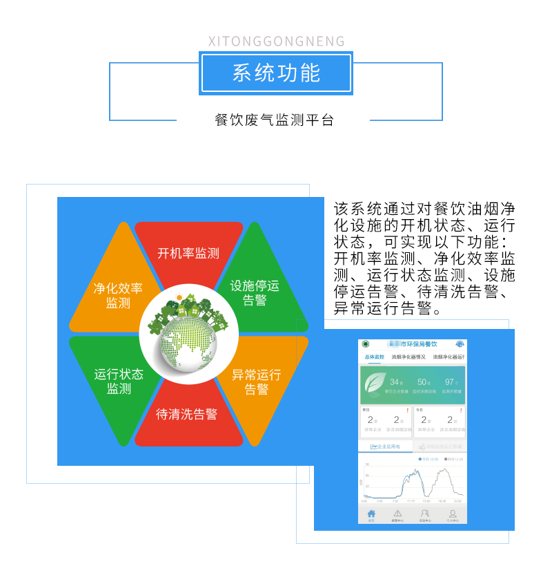 餐飲油煙凈化設(shè)備工況監(jiān)測系統(tǒng)由智能監(jiān)測設(shè)備、云平臺和用戶客戶端三部分組成,通過將現(xiàn)有油煙凈化設(shè)施改造為智能油煙凈化設(shè)備,或者在傳統(tǒng)油煙凈化設(shè)施用電側(cè)加裝免清洗智能傳感器,實(shí)現(xiàn)對油煙凈化裝置運(yùn)行工況廣覆蓋、高效率監(jiān)管。
