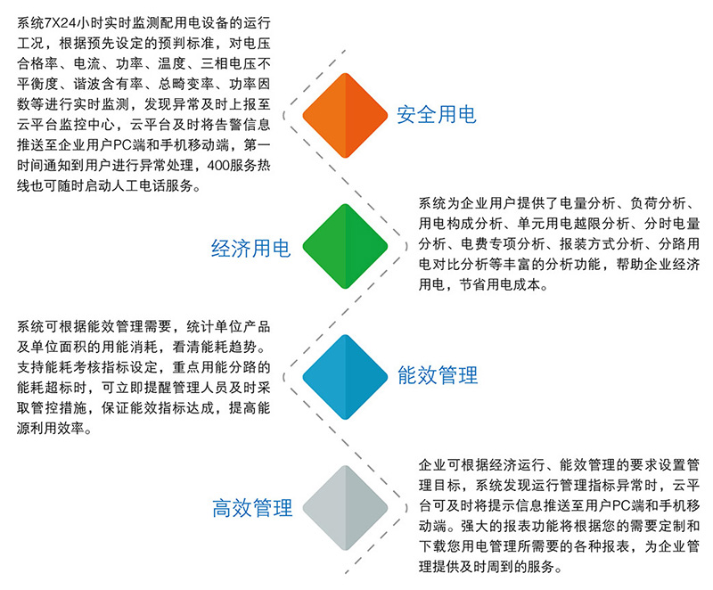 配用電監(jiān)測與管理系統(tǒng)通過應用物聯(lián)網技術、云計算技術和移動互聯(lián)網技術使得企業(yè)配用電管理智能化的成本大幅下降,集中建設在云端的云平臺監(jiān)控中心,為全體用戶提供7x24小時不間斷監(jiān)測服務,用戶可通過本地PC端或手機移動端及時獲知本企業(yè)配用電信息、異常告警信息,定期獲得運行分析報告,手機App隨時隨地輕松查詢,全面監(jiān)管企業(yè)的安全用電、經濟用電及電能質量指標。